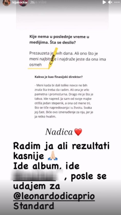 - Radim ja ali rezultati kasnije. Ide album, posle se udajem za Leonarda Dikaprija, Standard- napisala je Kristina.