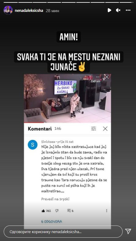 Nije joj bilo ništa zastrašujuće kad joj je iznajmio stan da bude sama, radio na pjesmi i spotu i bio za nju, svaki dan do svađe zbog nečeg što je ona zasr*ala dvije nedelje pred nje ulazak. Pirtom, verujem da svi koji su prošli kroz traume kao Tara naručuju pjesme da se puste na žurki od psiha koji ih je maltretirao - napisala je jedna osoba, a Ša je dodao: