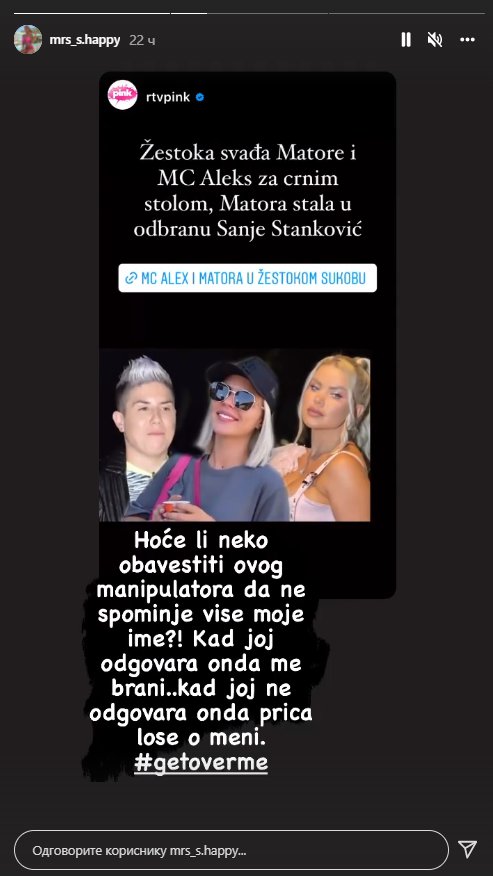 Nemaš pravo da pričaš takve stvari za moju bivšu djevojku. Rekla mi je (MC Aleks) da smatra da sam se u tom odnosu previše dala, pa se na kraju ispostavilo da me (Sanja) nije voljela kao partnera. Drugo mišljlenje joj je da je Sanja bila sa mnom zato što je izmanipulisana - rekla je Matora u emisiji.