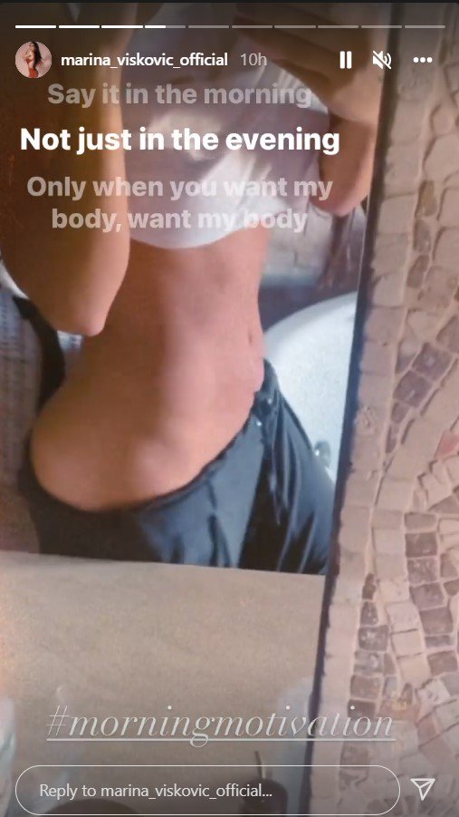 Naime, Marina je pozirala ispred ogledala u beloj majici i sivoj trenerci, a onda pokazala fit figuru, pa zanjihala kukovima i raspametila pratioce.