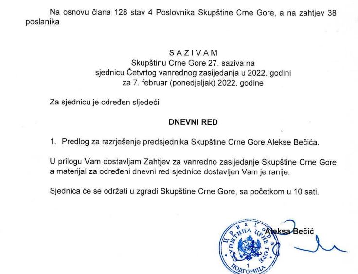 Skupština Crne Gore zakazala je za ponedjeljak, 7.febrauara sa početkom u 10 časova sjednicu na kojoj će se glasati o smjeni predsjednika parlamenta Alekse Bečića.
